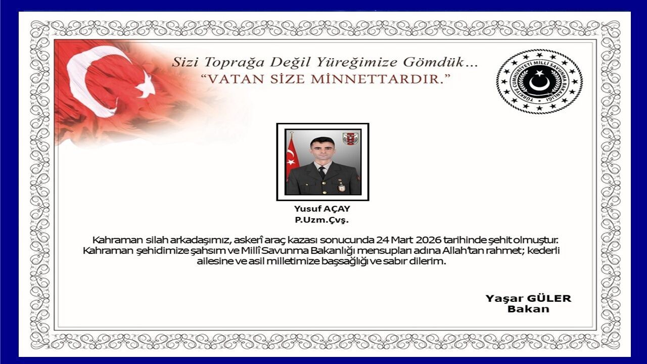 Bakanlıktan yapılan açıklamada, “24 Mart 2026 tarihinde Ağrı / Doğubeyazıt’ta meydana gelen askerî araç kazasında, kahraman silah arkadaşımız Piyade Uzman Çavuş Yusuf AÇAY şehit olmuştur” ifadelerine yer verildi.