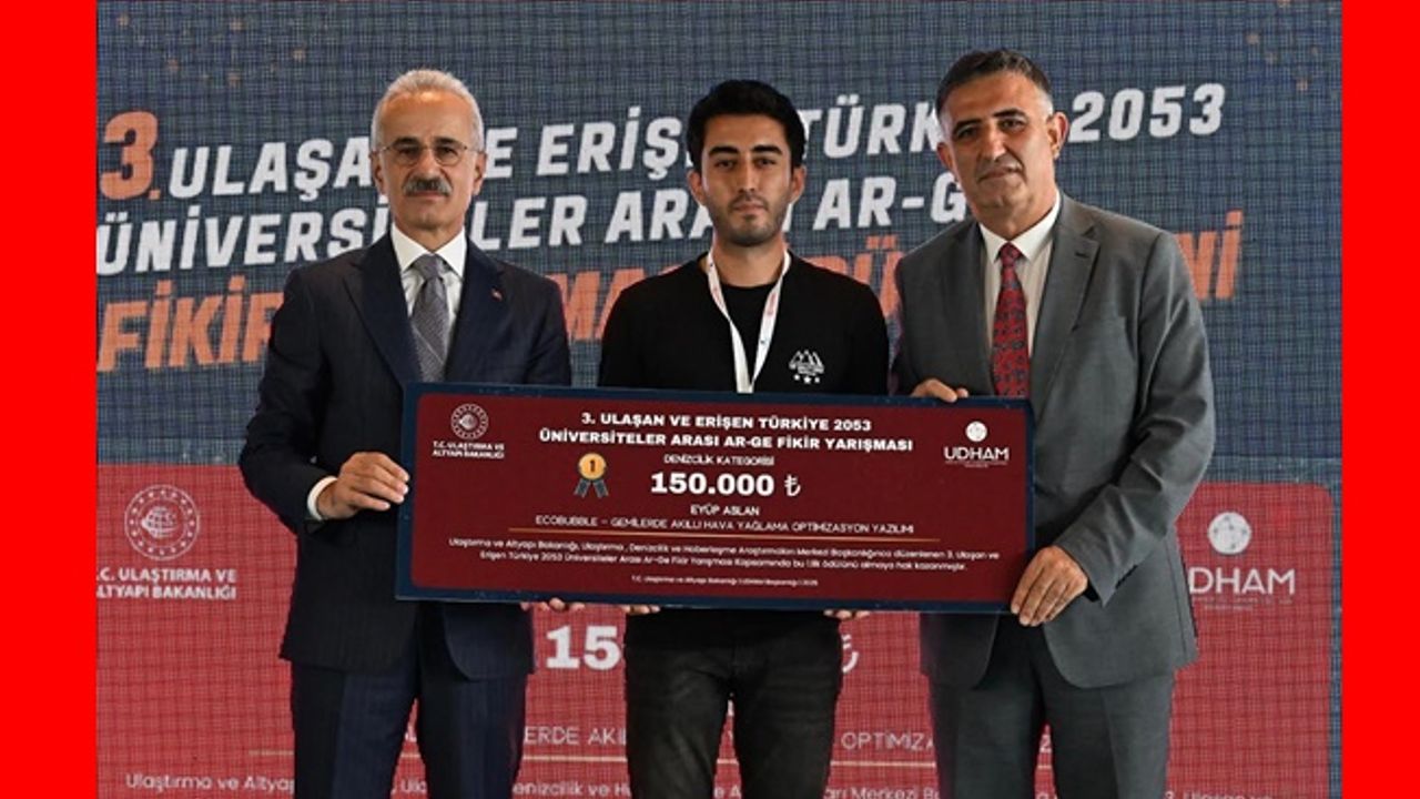 GTÜ öğrencisi Eyüp Aslan, Ulaştırma ve Altyapı Bakanlığı'nın "Ulaşan ve Erişen Türkiye 2053 Fikir Yarışması"nda geliştirdiği yapay zekâ destekli "EcoBubble" projesiyle birincilik kazandı.