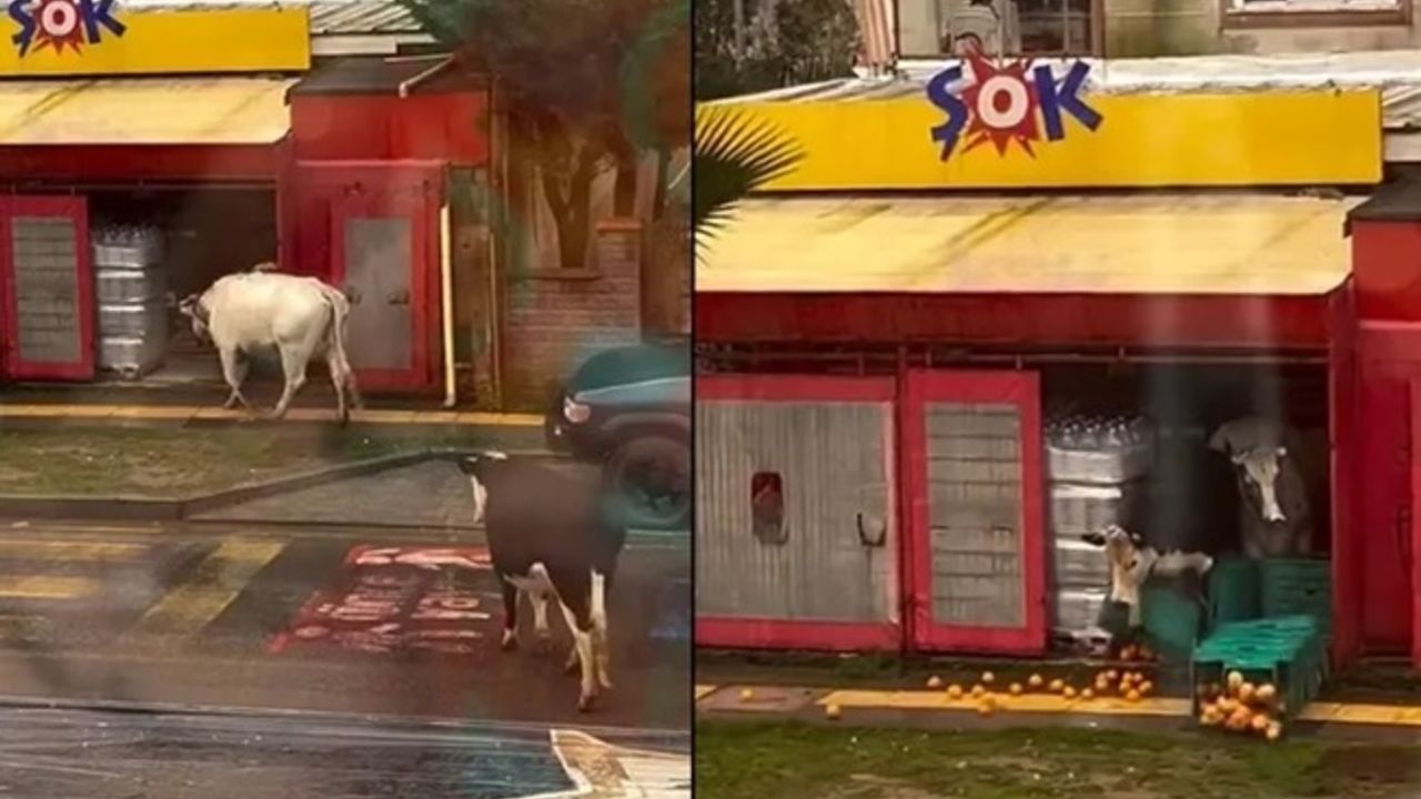 Çok sayıda beğeni ve yorum alan görüntülerde, markete giren iki ineğin marulları yediği, bu sırada temizlik yapan bir personelin elindeki paspasla hayvanları uzaklaştırdığı ve girişteki meyve sebze kasalarının devrilme görüntüleri şaşkınlık içinde izlendi.