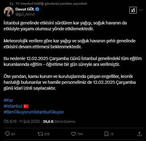 İstanbul Valiliği'nden gelen son dakika haberine göre il genelinde okullar yarın (12 Şubat Çarşamba) tatil edildi.
