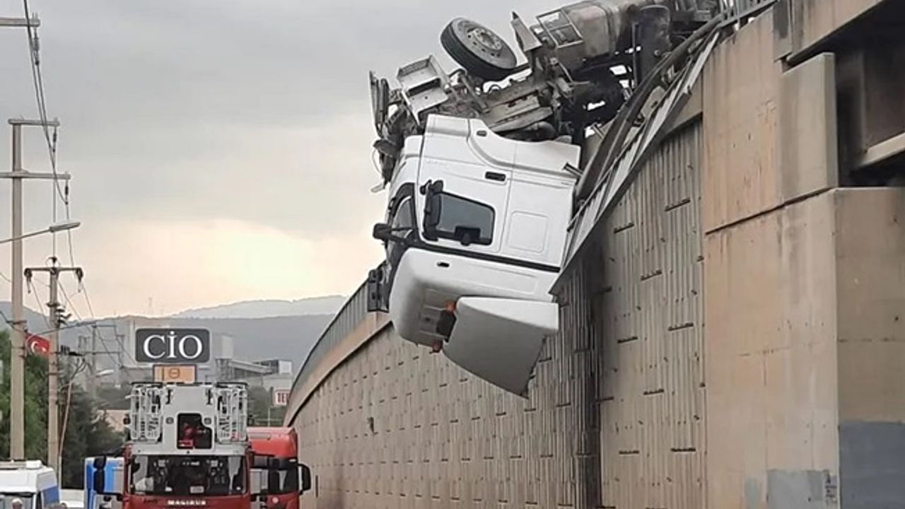 Ankara Caddesi 4. Sanayi Sitesi girişindeki yolda kontrolden çıkan tır, yaklaşık 12 metrelik viyadükte asılı kaldı.
