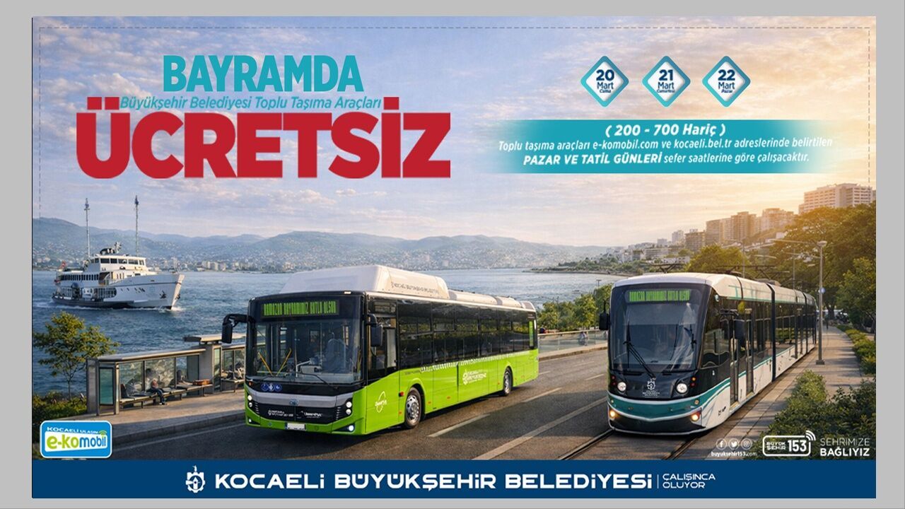Kocaeli Büyükşehir Belediyesi, Ramazan Bayramı süresinde otobüs, tramvay ve deniz ulaşımında ücretsiz ulaşım hizmeti verecek. Bayramın manevi atmosferine katkı sağlayan bu hizmet sayesinde aile ve kabir ziyaretleri ile bayramlaşma programları hiçbir ulaşım engeli yaşanmadan gerçekleştirilebilecek. 20 Mart Cuma günü başlayacak olan uygulama 22 Mart Pazar günü saat 24.00’te sona erecek.