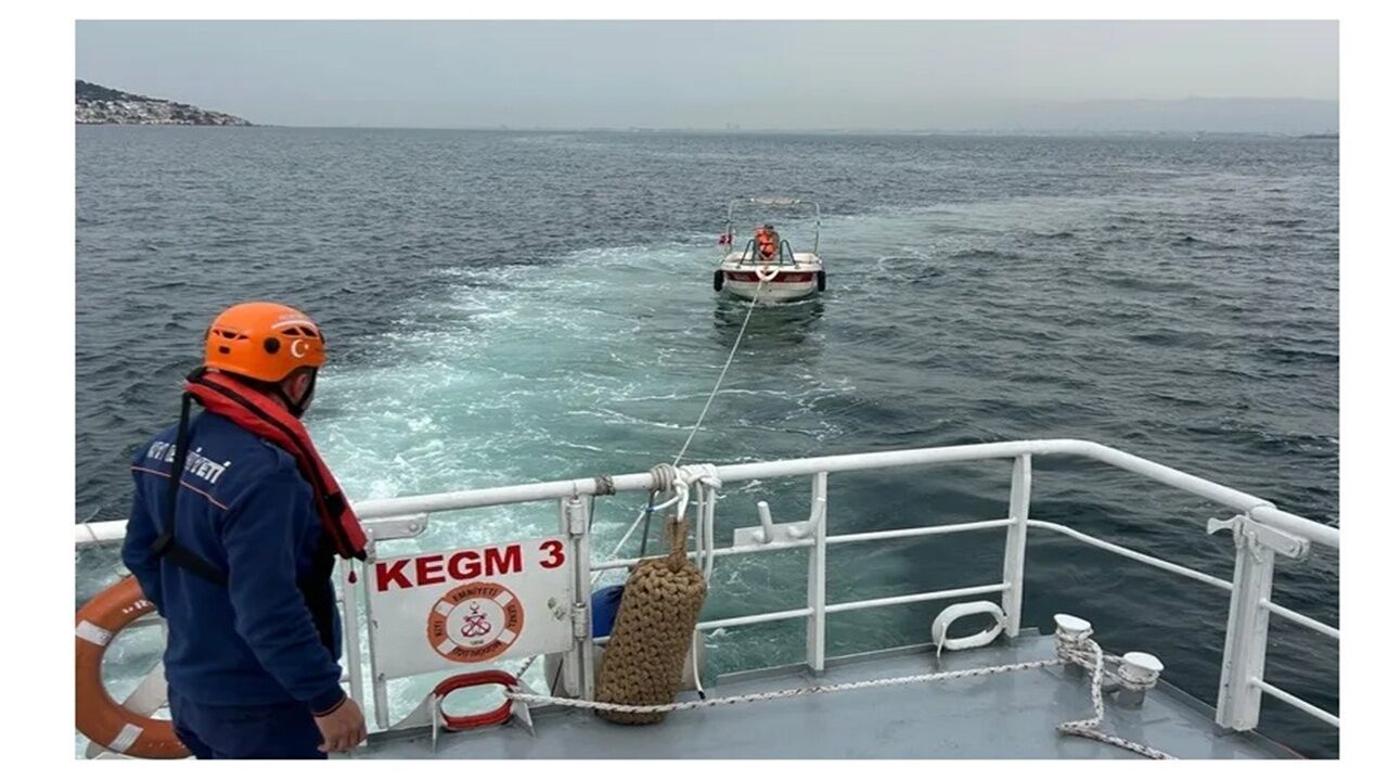 Bölgeye sevk edilen KEGM-3 hızlı tahlisiye botu, arızalı tekneyi yedekleyerek Küçükyalı Balıkçı Barınağı’na ulaştırdı.