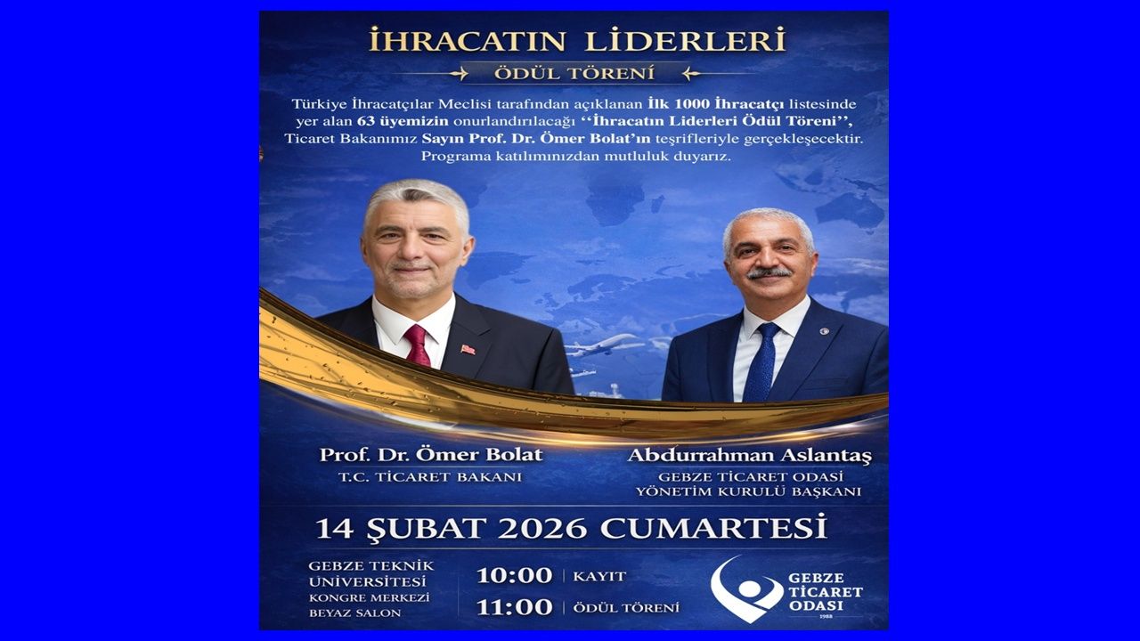 Ticaret Bakanı Prof. Dr. Ömer Bolat, Gebze Ticaret Odası tarafından düzenlenen “İhracatın Liderleri Programı”na katılmak üzere 14 Şubat 2026 Cumartesi günü Gebze’ye geliyor. Programda, ihracat başarılarıyla öne çıkan 63 firma ödül alacak.