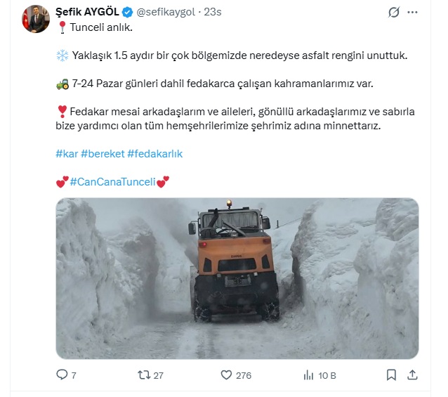 Vali Aygöl, yaklaşık 1,5 aydır Tunceli’nin birçok bölgesinde asfaltın dahi görünmediğini vurgulayarak, karla mücadelede görev alan ekiplerin 7 gün 24 saat esasına göre, pazar günleri dâhil fedakârca çalıştığını ifade etti. Kar temizleme ve yol açma çalışmalarında görev alan personelin büyük özveri gösterdiğini belirten Aygöl, bu zorlu süreçte sahada emek veren tüm çalışanları “kahramanlar” olarak nitelendirdi.