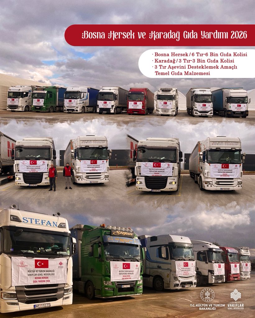 Kültür ve Turizm Bakanlığı Vakıflar Genel Müdürlüğü, Ramazan ayı dolayısıyla Karadağ ve Bosna Hersek’teki ihtiyaç sahiplerine yönelik hazırlanan gıda yardımlarının yola çıktığını duyurdu. Yardım kolilerini taşıyan tırlar, Kapıkule Sınır Kapısı’ndan geçiş yaparak Balkanlar’a doğru hareket etti.